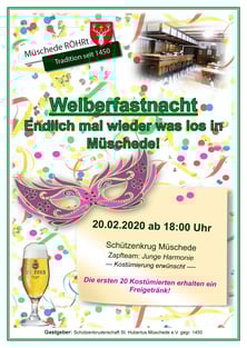 Die Müscheder Schützenbruderschaft freut sich auf zahlreiche kleine und große Besucherinnen und Besucher aus Müschede und Umgebung bei selbstverständlich freiem Eintritt. Bereits einige Tage vorher, Weiberfastnacht, am Donnerstag, 20.02.2020, lädt die Müscheder Schützenbruderschaft alle Närrinnen und Narren in die Ehrenamtskneipe „Schützenkrug“ ein. Unter dem Motto „Endlich mal wieder was los in Müschede!“ geht es dann ab 18.00 Uhr dort so richtig ab.