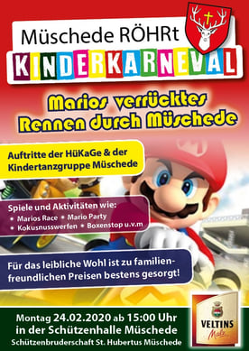 Dieses Jahr lautet das Motto: „Marios verrücktes Rennen durch Müschede“. So manche Eltern oder Großeltern werden sich dabei auch sicher gerne in ihre eigene Kindheit mit ihren damaligen Helden zurückversetzt fühlen. Neben allerlei spannenden Aktionen und Spielen wie „Marios Race“, „Mario Party“, „Kokosnusswerfen“, „Boxenstop“ und vielen anderen lustigen Spiele werden bei diesem aus dem dörflichen Leben nicht mehr wegzudenkenden Kinderkarneval mit überörtlicher Bedeutung auch wieder die schönsten und originellsten Kostüme prämiert.