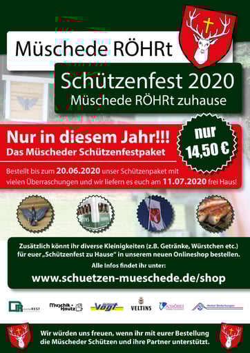 Nur in diesem Jahr bieten die Schützen das eigens kreierte Müscheder Schützenfestpaket mit vielen Überraschungen für „das Schützenfest zu Hause“ an. Zum Preis von 14,50 € erhalten Bestellerinnen und Besteller ein Schützenfestpaket voller Überraschungen. Dazu können dann zusätzlich heimisches Bier aus Grevensteiner Herstellung und grillbare Leckereien des auch in Müschede sehr aktiven Caterers Stefan Alteköster aus Niederense geordert werden. Alteköster betreibt die Müscheder Imbissstube „Zur kurzen Rast“, beliefert die Müscheder Ehrenamtskneipe „Schützenkrug“ mit Speisen und führt dort auch Veranstaltungen durch. Außerdem sorgt er in Müschede auf Schützenfesten sonst auch für eine reichhaltige Speisenauswahl.