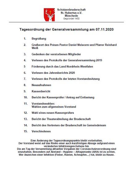 Die St.-Hubertus-Schützen aus dem Eulendorf begehen am Samstag, dem 07. November 2020, um 19.00 Uhr, in der großen Schützenhalle unter Corona-Bedingungen ihre diesjährige Generalversammlung.