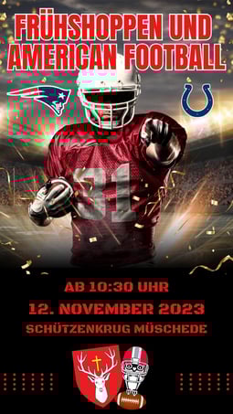 Wir freuen uns, euch das bevorstehende Event "Frühshoppen und NFL" ankündigen zu dürfen! In Kooperation mit der Schützenbruderschaft Müschede, laden wir euch am 12. November ab 10:30 Uhr herzlich ein, einen geselligen Tag im Schützenkrug zu verbringen.