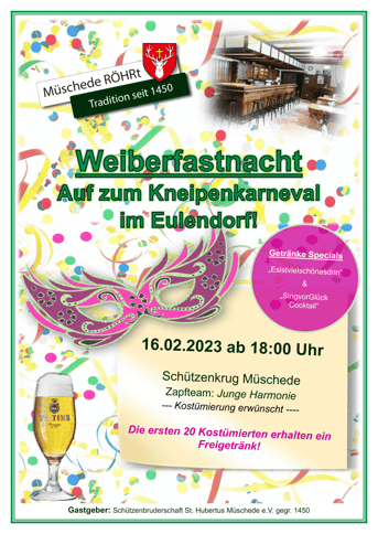 Am Donnerstag, 16.02.23, findet im Eulendorf Müschede in der Ehrenamtskneipe „Schützenkrug“ ab 18.00 Uhr WEIBERFASTNACHT statt. Die Bewirtung übernimmt das Zapfteam des Chores Junge Harmonie. Kostümierung ist ausdrücklich erwünscht. Die ersten 20 Kostümierten erhalten ein Freigetränk. Auch Getränkespecials warten auf die Gäste.