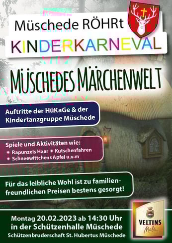 Die Schützenbruderschaft St. Hubertus Müschede veranstaltet am Rosenmontag dieses Jahres (20.02.2023) ab 14.30 Uhr in der Müscheder Schützenhalle nach drei Jahren Corona-Pause wieder ihren traditionellen Kinderkarneval.