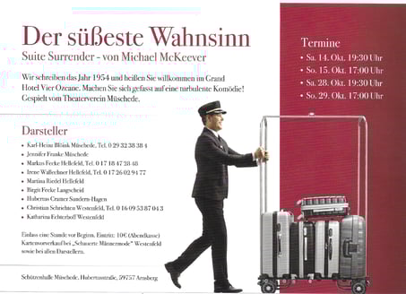Das Stück spielt im Jahr 1954. Die Zuschauerinnen und Zuschauer werden im Grand Hotel „Vier Ozeane“ willkommen geheißen und können sich auf eine turbulente Komödie gefasst machen. Die Spannung steigt - in knapp 4 Wochen ist es soweit, dann gibt es kein Halten mehr. Wer die letzten Stücke der Theaterabteilung in der Müscheder Schützenhalle gesehen hat weiß, dass es sich lohnt, sich Zeit für diese Aufführungen zu nehmen.