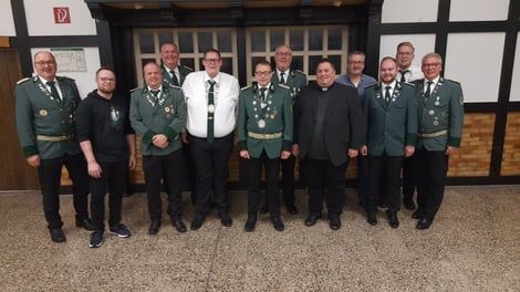 Bild: Neu- und wiedergewählte Vorstandsmitglieder mit Schützenkönig Norbert Hörster, Jugendschützenkönig Marius Schulte-Weber, Bundesjungschützenkönig Matthias Fricke, Oberst Raimund Sonntag, Major Michael Schmitz, Adjutant Rudi Voß und Präses Daniel Meiworm.