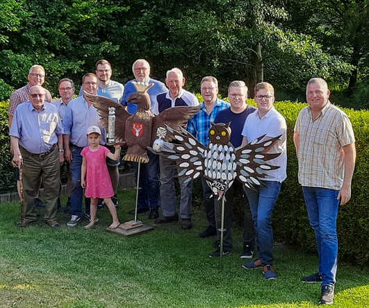 Zur Vogelbesichtigung traf sich jetzt der geschäftsführende Vorstand sowie Mitglieder des Ehrenvorstandes und des allgemeinen Vorstandes der Schützenbruderschaft St. Hubertus Müschede mit weiteren Gästen bei Vogelbauer Stephan Pape in der Gesmecke. Mit dabei natürlich auch Schützenkönig Dirk Voß sowie Jugendschützenkönig und amtierender Bundesjungschützenkönig Matthias Fricke.