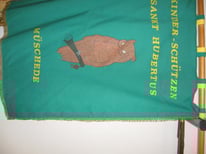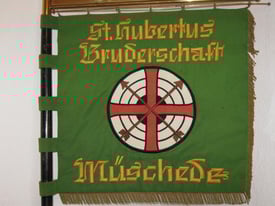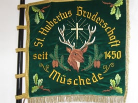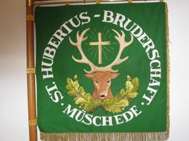 Eingerahmt vom dunklen Grün strahlt hell die Lichtung im Ardennenwald. Gekleidet mit dem Jägeranzug, den schweren Hirschfänger sicher am Gürtel befestigt, das Jagdhorn locker über der Schulter hängend und den treuen Hund an seiner Seite, frönt Hubertus seiner Lieblingsbeschäftigung, der Jagd. Da passiert etwas, das sein Leben von Grund auf verändern wird. Ein kapitaler 13 Ender tritt aus den Bäumen hervor, ein goldenes Kreuz zwischen dem mächtigen Geweih. Ergriffen auf das rechte Knie gesunken, die Hand auf dem pochenden Herz und mit der Linken am Speer nach Halt suchend, schaut Hubertus ehrfurchtsvoll auf das strahlende Kreuz, von dem die Botschaft für sein weiteres Lebens ausgeht. Diese uns allen bekannte, dem Heiligen Hubertus zugeschriebene Legende, zeigt die Vorderseite der Bruderschaftsfahne. Links im Baum schaut aufmerksam die „Müscheder Eule“ zu, gleichsam um als Chronist alle Einzelheiten dieser Begegnung festzuhalten. Umrahmt wird die Lichtung von der Inschrift „St. Hubertus Bruderschaft Müschede“. Die Initialien F.H. weisen auf den Gestalter der Fahne hin. Diese beschriebene Szene ist dem Kriegerwahrzeichen von 1916 entlehnt, welches rechts im Eingang der Schützenhalle die Wand ziert.