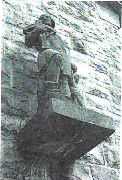 Die Hubertusfigur an der Vorderfront der Kirche stellt den Hl. Hubertus als Jäger dar.