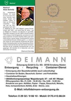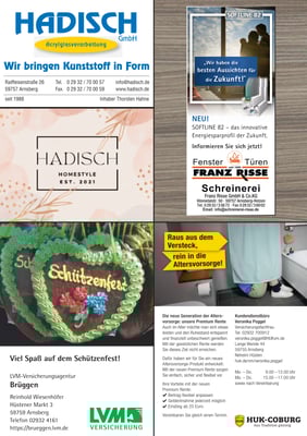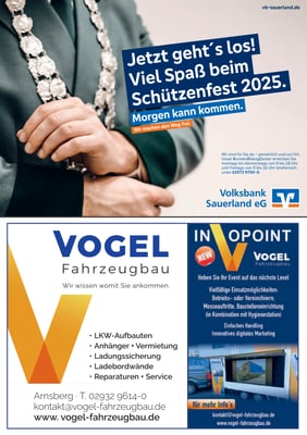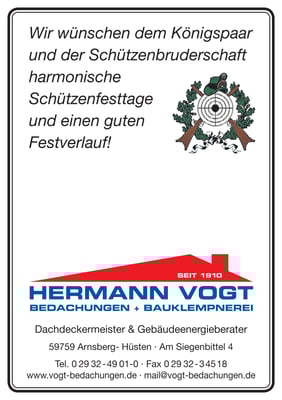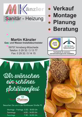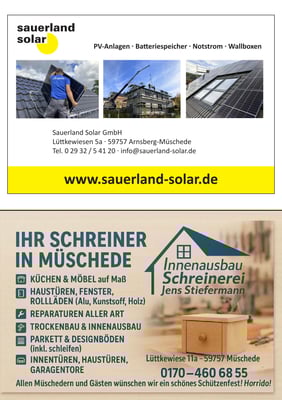 Als offizieller Sponsor der Schützenbruderschaft Müschede unterstützen Sie diese finanziell und werben durch ihre Anzeige in der Festschrift „Schützen Aktiv“, auf der Homepage und per Beamer/Fernseher (in der Schützenhalle) bei diversen Veranstaltungen der Bruderschaft.